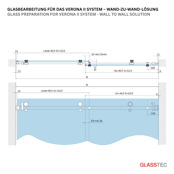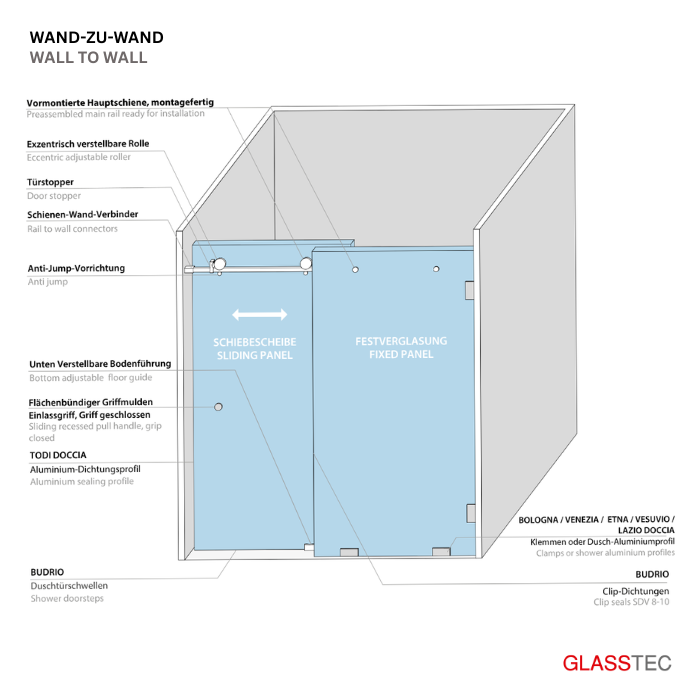 Bath and shower, Fixtures, Shower Sliding Systems, VERONA IIWall-to-Wall Sliding Shower Door – Minimalist Frameless Enclosure System